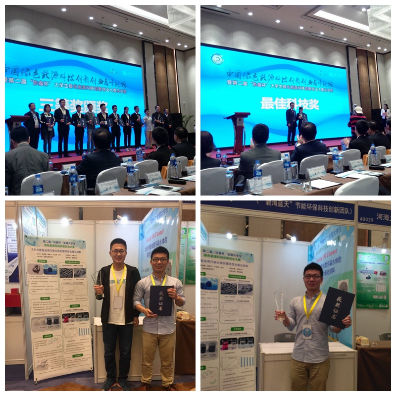 竞博JBO官网倪凌峰等同学在李轶老师指导下,以作品“用于可见光原位修复油类污染水体的漂浮型光催化材料”荣获大赛三等奖;蔡炎等同学在陈卫老师指导下,以作品“一种低能耗强磁分离除藻净水工艺及藻醇发电装置”荣获本次大赛“最佳科技奖”。