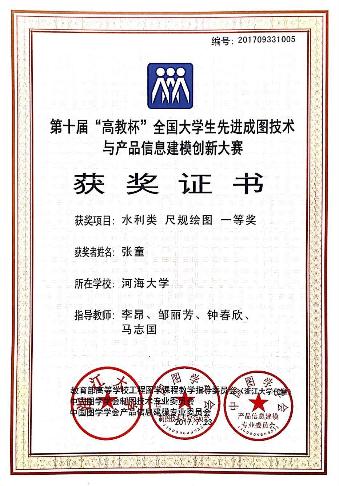 由教育部高等学校工程图学教学指导委员会和中国工程图学学会制图技术专业委员会联合举办的第十届“高教杯”全国大学生先进成图技术、产品信息建模创新大赛于2017年7月21日~24日在兰州交通大学举办。我院2015级给排水科学与工程专业张童同学积极参与,经过选拔和培训,在港航院老师的指导下,荣获水利类尺规绘图一等奖,水利类个人全能二等奖以及水利类团体一等奖的好成绩。