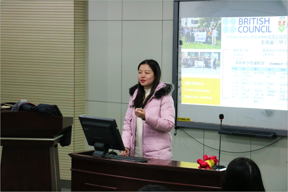 接下来由王晶老师介绍“2+2”和“3+1+1”项目。学校会为需要参加该项目的同学准备语言衔接课程,同学需要根据考出的雅思成绩进行不同时间的语言衔接课程,若成功完成语言课程则无需再考雅思。接着王老师详细和同学们说明了在亚伯大学所需的费用。除去国际奖学金等减免的费用后一年本科学费约为一万一千一磅,一年在亚伯大学包括学费、生活费等在内的的总费用仅需约21万人民币。王老师还为大一同学详细介绍了亚伯大学的英语夏令营。亚伯国际英语中心位居英前三甲,在英语夏令营里同学们能进行语言学习课程和专业学习课程,有轻松愉快的课堂,有大把的机会走出课堂进入自然进行探索和实验,有丰富的社交及文化生活,还能和来自不同国家的学生交流合作。